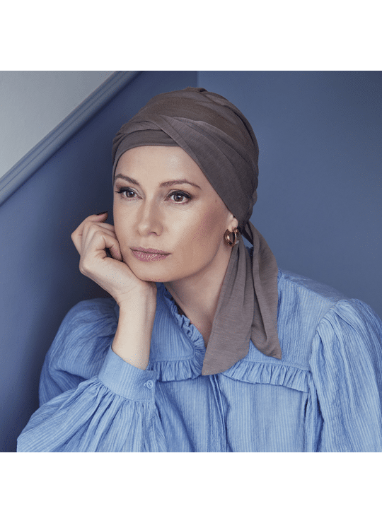 Confectionné dans une matière douce et respirante, ce turban est idéal pour les cuirs chevelus sensibles, notamment en période de traitement médical. Il ne comprime pas, ne glisse pas et se porte aussi bien en journée qu’en soirée.