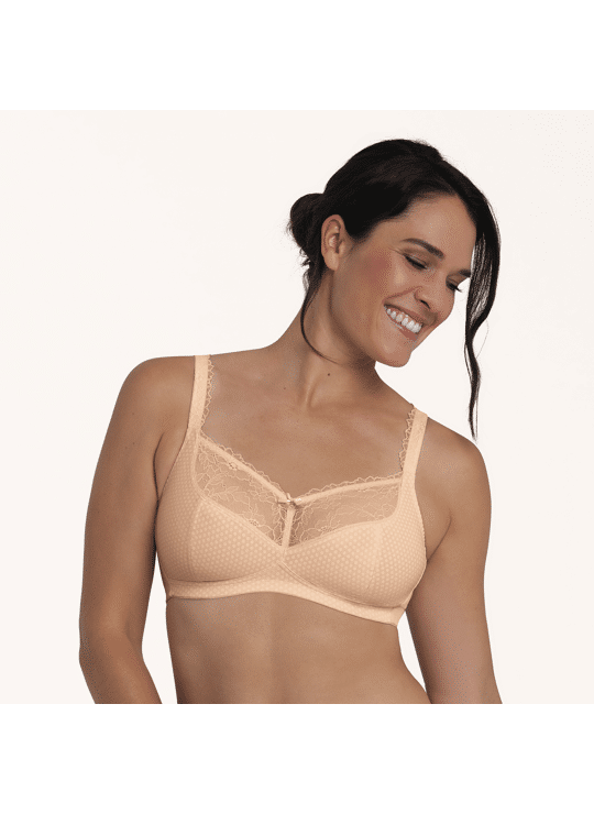 ELOISE allie élégance féminine et fonctionnalité réfléchie. Une fine dentelle florale en fil recyclé orne le haut de bonnet, les bretelles et le bas de bonnet. Un motif à pois moderne apporte une touche de fraîcheur contrastante. Les bonnets en trois parties avec couture transversale, le tulle renforcé sur le haut de bonnet et la charmeuse douce sur le bas garantissent un maintien sûr. Les poches pour prothèse des deux côtés, les bretelles plus larges en grandes tailles et un dos renforcé assurent un confort optimal. Un petit bijou au décolleté vient parfaire le look avec raffinement. Parfait au quotidien, avec ce petit plus.