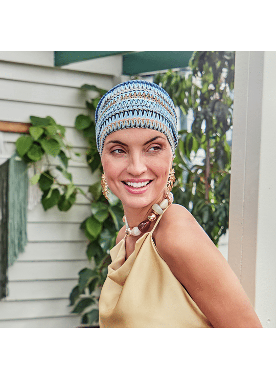 Le Turban 3034 Ruby Skye couleur 0783 de Christine Headwear est un modèle féminin et lumineux, conçu pour accompagner les femmes en période de traitement ou en cas de perte de cheveux.